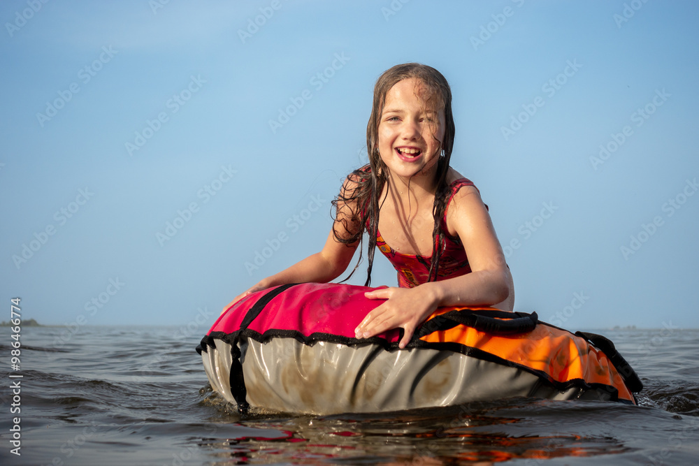 The girl swims and has fun in the water using an inflatable ring.