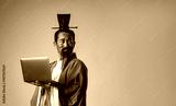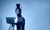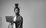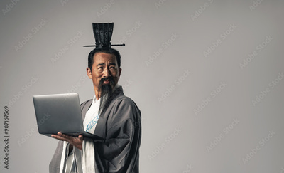 三国志に登場する諸葛孔明のような中国歴史上の人物がノートパソコンを使うシーン