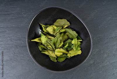 Thai lime dried leaves, makrut lime or Citrus hystrix leaf pile, kaffir lime dry sprouts, Southeast Asia spices