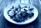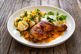 Oven roasted chicken thigh with boiled potatoes and fresh vegetables on wooden table