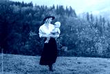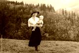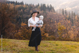 Mom tenderly hugs her little son during an autumn walk among the trees, they are wearing warm clothes