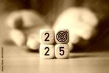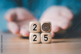 Businessman giving 2025 with dartboard arrow print screen on wooden block cube for setup business setup objective target and goal when change to new year concept.
