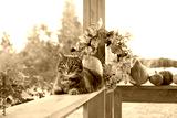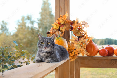 autumn background. Portrait of grey cat with ripe pumpkins, decorative wreath in garden. symbol of autumn season. Halloween, Thanksgiving holiday. fall time concept.