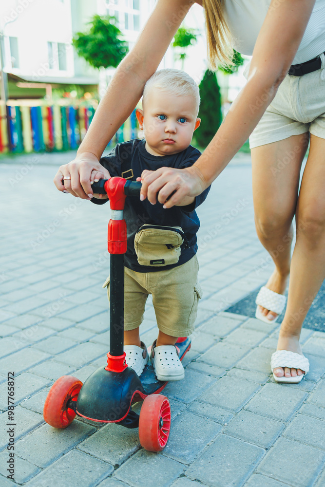 A mother teaches her little son to ride a scooter. Games of mother and child on the street. The concept of a family walk with a child
