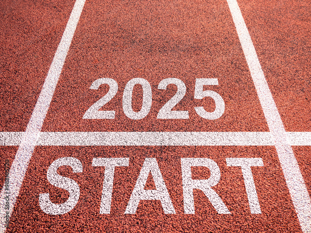 Start 2025 inscription on asphalt. Concept of beginning of new year. Starting line on road for runners. Start of 2025 season. Holiday banner template for new year. Start 2025 for success. 3d image