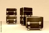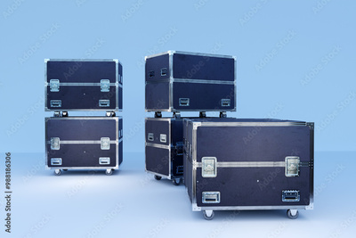 Shockproof cases with musical equipment. Several trunks on wheels on blue. Black cases with acoustic technique. Rack cases for audio equipment. Transport boxes with musical apparatus.
