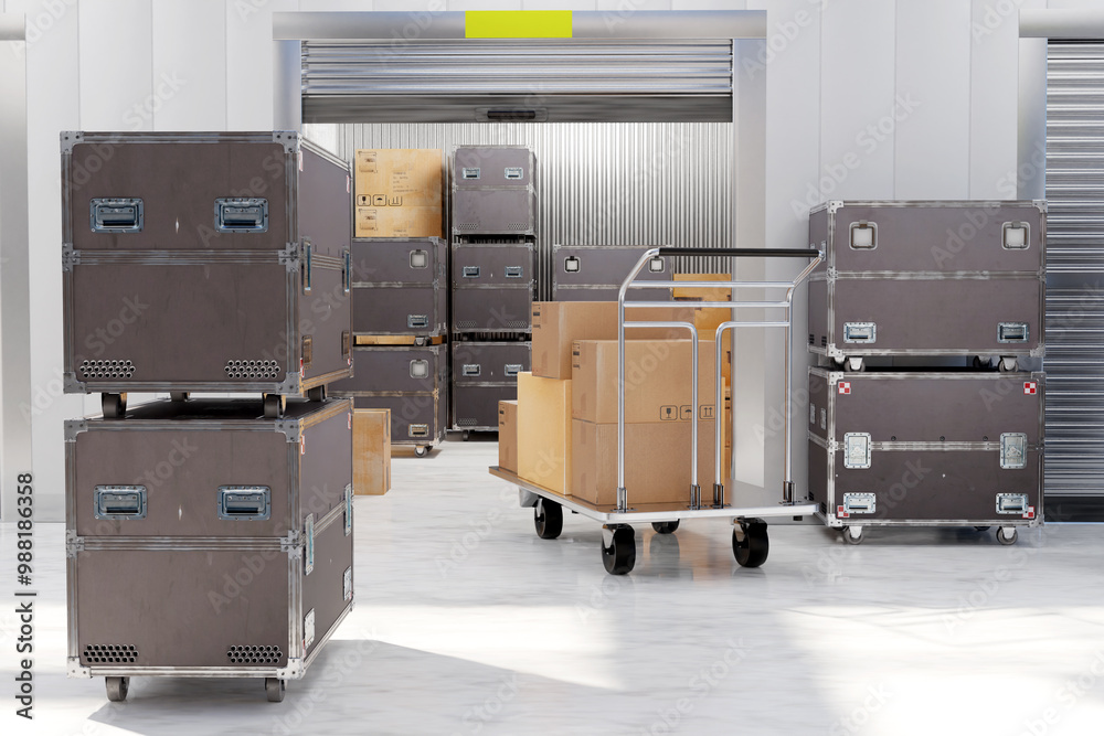 Containers with musical equipment. Storage room with open gate. Trunks for transporting apparatus at guest tour. Warehouse for musical equipment. Containers with technique on wheels. 3d image