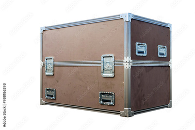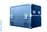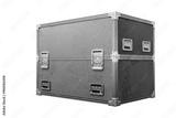 ATA case with concert equipment. Black box with lighting apparatus. Professional case for touring with equipment. ATA case isolated on white. Trunks for technique for concerts and shows. 3d image