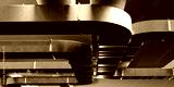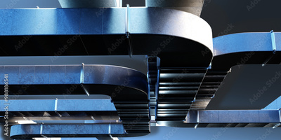Air handling unit. Ventilation pipes in ceiling. Air-conditioning ducts. Ventilation system in industrial building. Industrial utilities. Air handling unit bottom view. Shafts ventilation. 3d image
