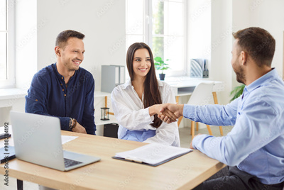 Wife and husband, as clients, shake hands with a consultant or agent, confirming a contract or deal during a meeting. Their handshake symbolizes the finalization of the agreement, contract or deal.