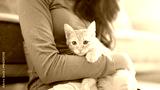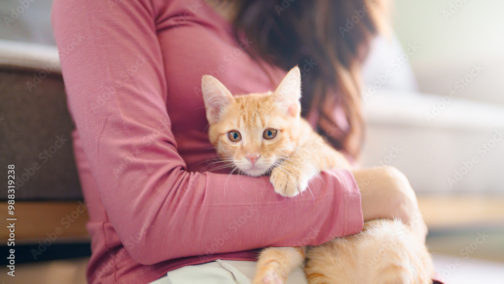 happy asian woman petting with lovely pet kitten ginger cat at home