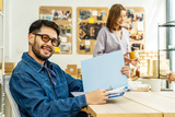 Portrait Asian Businessman sitting looking in data file in Modern Diverse Office Working on Financial, Business and Marketing Projects, Behind her business team discussing and brainstorming on project