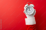A Santa Claus hand holding a vintage alarm clock against a red background symbolizing holiday countdown and festive anticipation