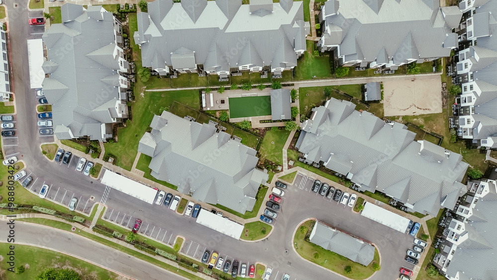 Straight aerial view new construction apartment complex with metal roofing, outdoor areas, busy parking in fast growing area near Pflugerville northeast of downtown Austin, Texas, housing market
