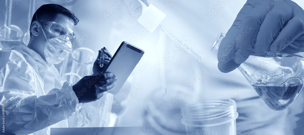 Man laboratory assistant. Guy scientist with e-tablet. Laboratory assistant in protective overalls. Research center employee. Man Scientist holds flask with chemical substance. Hand with test tube.
