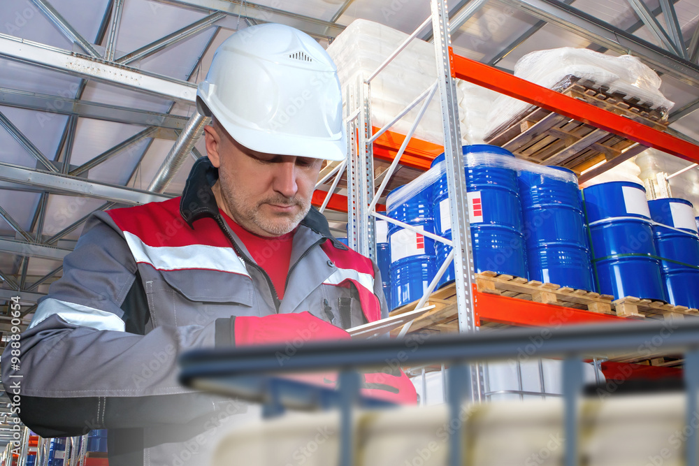Man manager fuel warehouse. Logistics center contractor with gadget in hands. Warehouse manager near shelves with barrels. Man in industrial building. Worker in gray uniform works in fuel warehouse