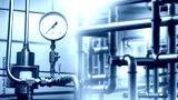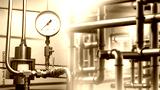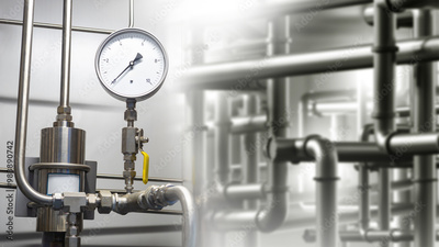 Gas equipment. Chemical production. Pressure sensor on steel pipe. Gas equipment at factory. Chemical industrial technologies. Gas boiler station. Metal pipes in basement of factory