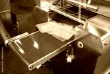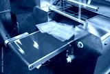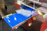Equipment for vacuum packaging goods. Industrial machine for food production. Conveyor for vacuum packaging. Machine for extracting air from polythene container. Industrial equipment for vacuuming