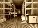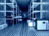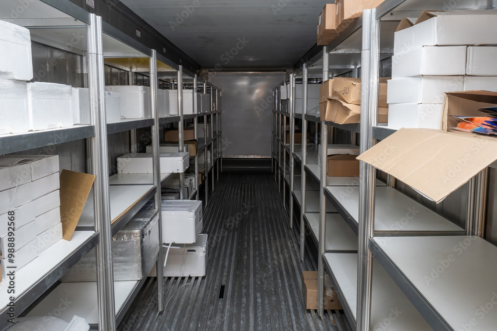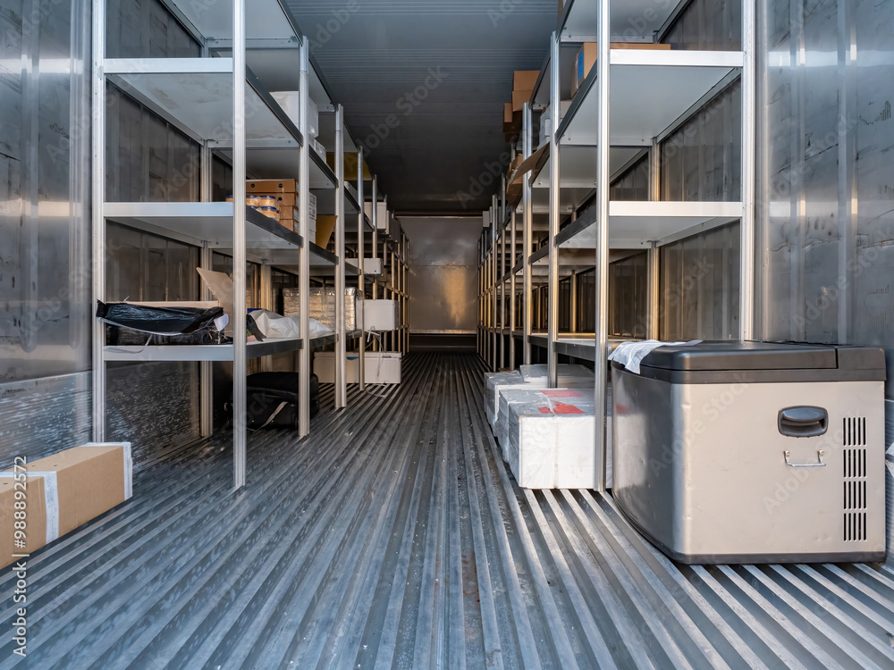 Refrigeration chamber in container. Portable freezer warehouse. Refrigeration chamber with shelves along walls. Freezer warehouse inside sea container. Refrigeration chamber in container for truck