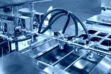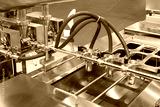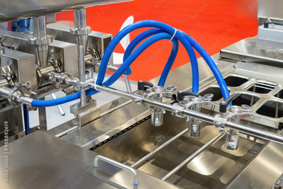 Industrial equipment. Liquid dispenser for food production. Equipment for pouring sauce. Industrial apparatus at food factory. Modern equipment for production automation. Machine for dosing