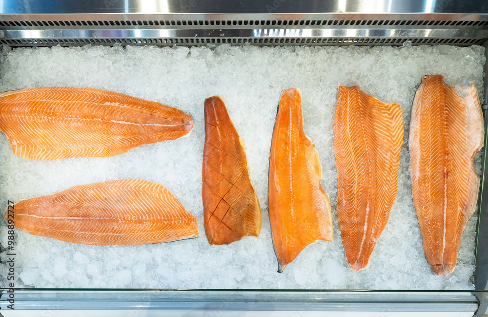 Red fish on supermarket counter. Salmon fillet top view. Red fish for dietary nutrition. Delicious seafood on counter with ice. Selling red fish fillets in grocery store. Healthy chilled seafood