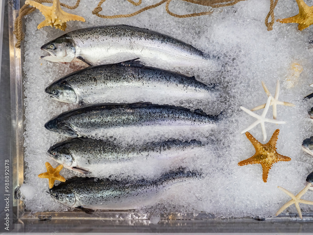 Salmon fish on ice cubes. Seafood store counter. Sale of fish from salmon family. Chilled fish is sold in supermarket. Fresh starfish and salmon top view. Seafood caught by fishermen in ocean