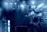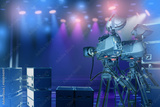 Videographer camera. Equipment for filming concert. Professional cameras on tripods. Preparing to shoot party. Filming equipment. Two cameras near transport cases. Technologies for videographer
