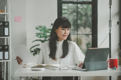 Young asian accountant is working at her desk, checking financial documents and using her tablet