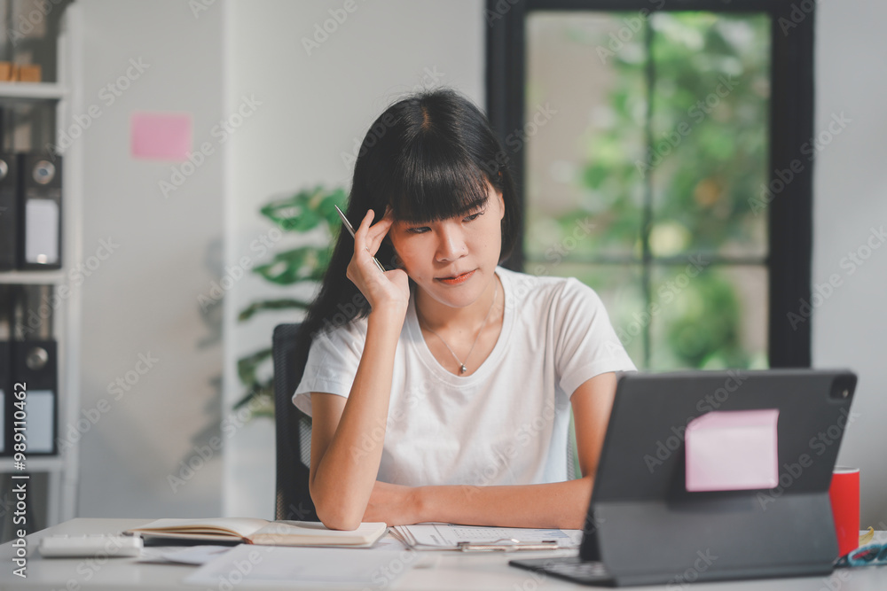 Young asian woman works from home, focused on her laptop, embodying remote work and small business challenges in the digital age