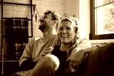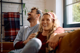 Happy couple laughing while relaxing together on sofa.
