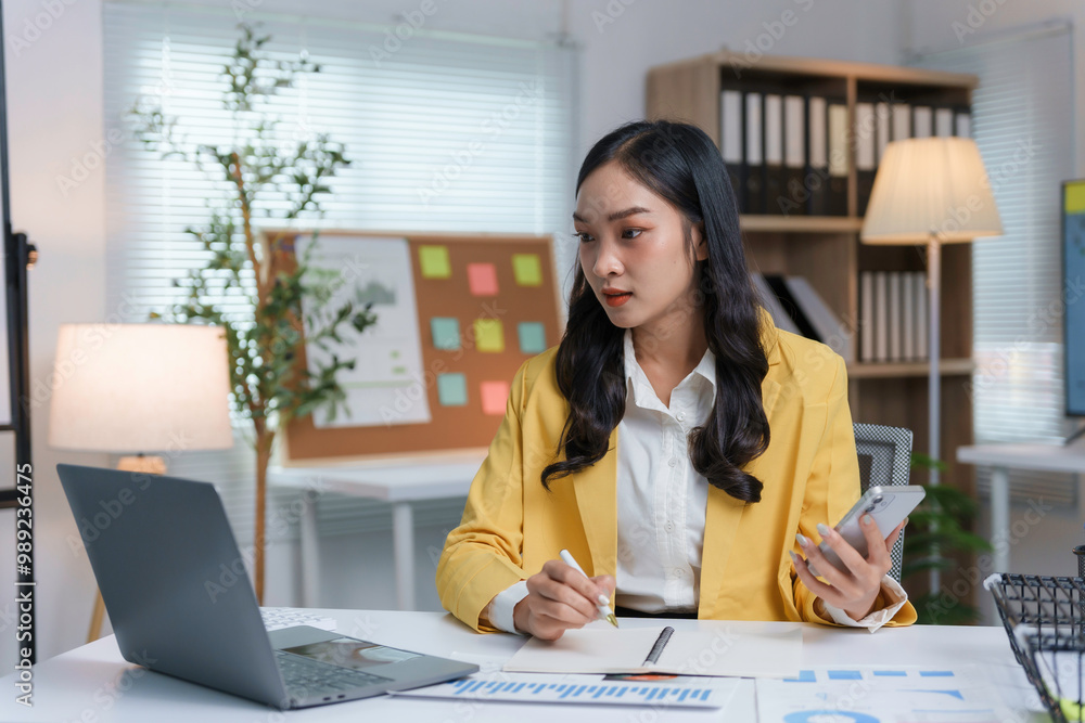 Businesswoman holding a smartphone and taking notes while working on a laptop in her bright modern office