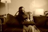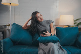 Young woman is sitting on a comfortable blue sofa in her living room, looking away while using her phone