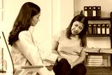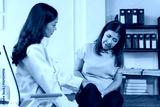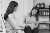 Female doctor is comforting her patient who is suffering from knee pain while sitting on an examination table
