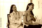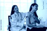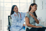 Female doctor is examining her patient who is suffering from shoulder pain, showing concern and care