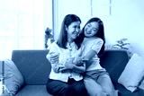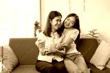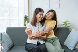 Adult daughter is hugging her senior mother on a grey sofa, both laughing cheerfully