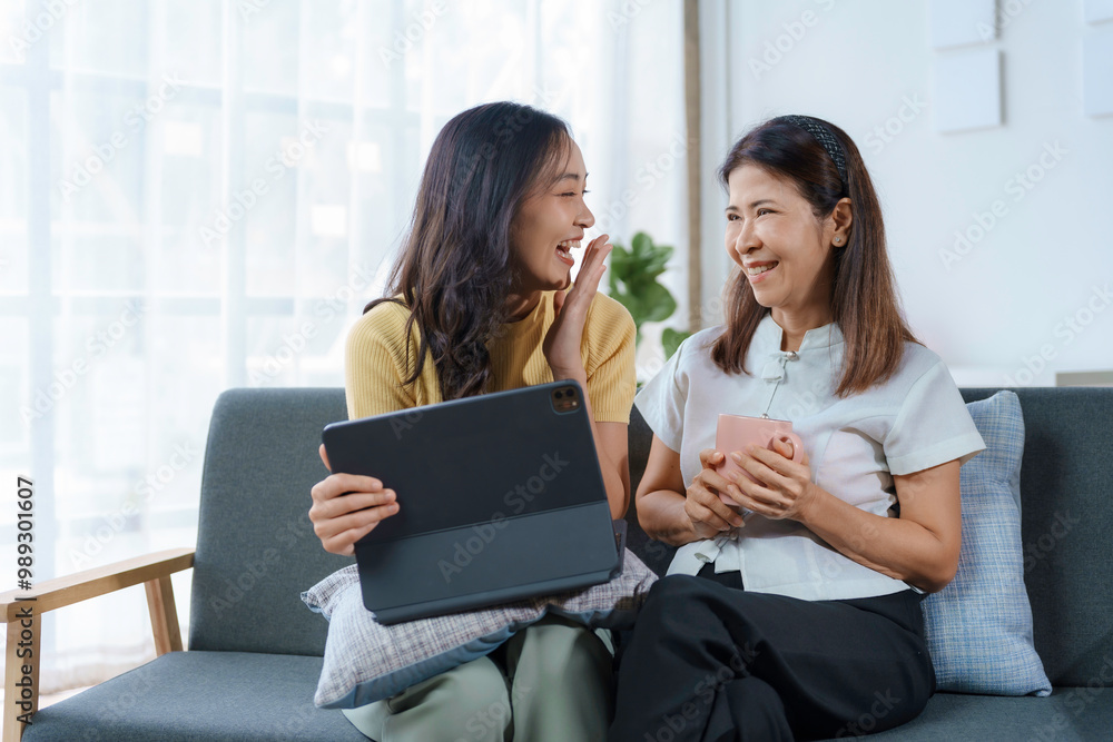 Happy asian family, mother and daughter using tablet and laughing while sitting on sofa in living room at home