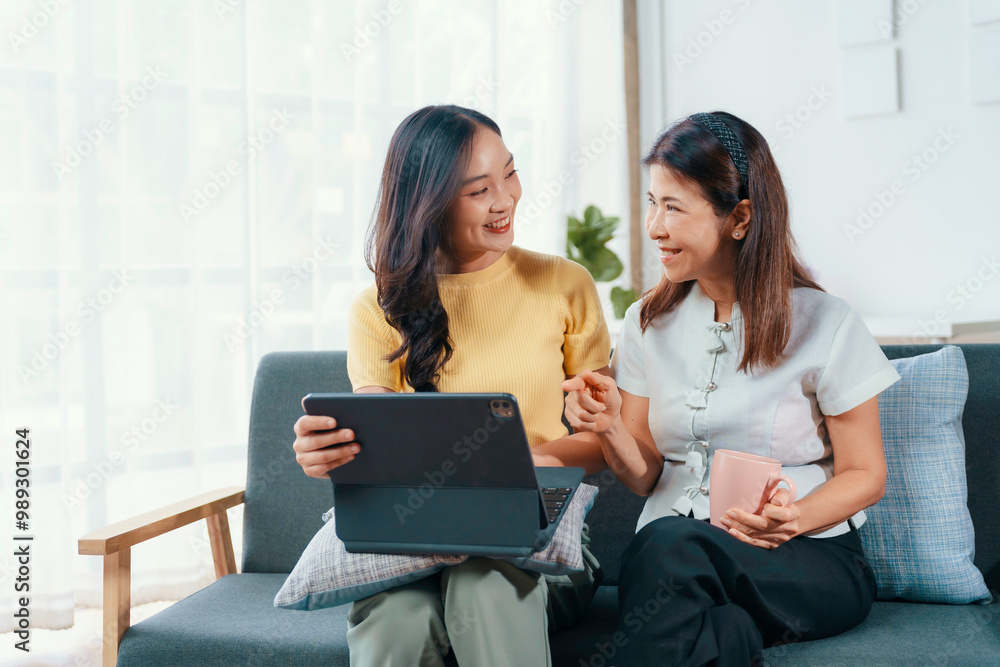 Young woman is showing something funny on a tablet to an older woman while sitting on a sofa