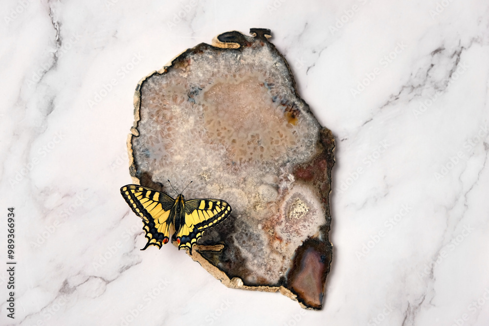butterfly on agate slice stone, abstract light marble background. Relax, meditation, harmony, calm. Nature balance, Calm Mind, Living by Nature, Harmony of Life concept. top view