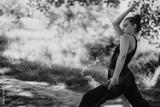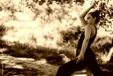 Lovely girl dancing in nature, displaying a graceful modern dance performance outdoors among lush greenery