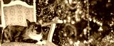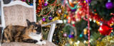 brown tricolor adult domestic cat, Christmas Tree With Ornaments background, traditional peaceful christmastime Moments, festive season, perfect footage for social media