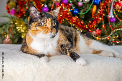 brown tricolor adult domestic cat, Christmas Tree With Ornaments background, traditional peaceful christmastime Moments, festive season, perfect footage for social media
