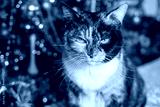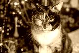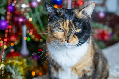 brown tricolor adult domestic cat, Christmas Tree With Ornaments background, traditional peaceful christmastime Moments, festive season, perfect footage for social media