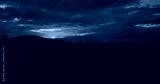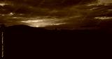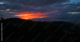 AERIAL: Burnt orange autumn skies gently illuminate the forest-covered hills below the cloudy sky. Spectacular aerial view of the setting sun shining on the dark countryside on an idyllic fall evening