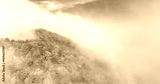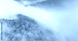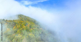 AERIAL: Flying over the verdant forest covered hill in the idyllic Slovenian countryside enshrouded in morning mist. Scenic drone view of the woods changing leaves, covered in early October fog.