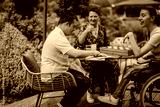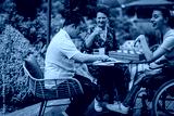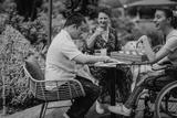 A young boy with Down syndrome, a girl in a wheelchair, and an older woman play cards together, enjoying a fun and inclusive bonding experience outdoors.