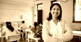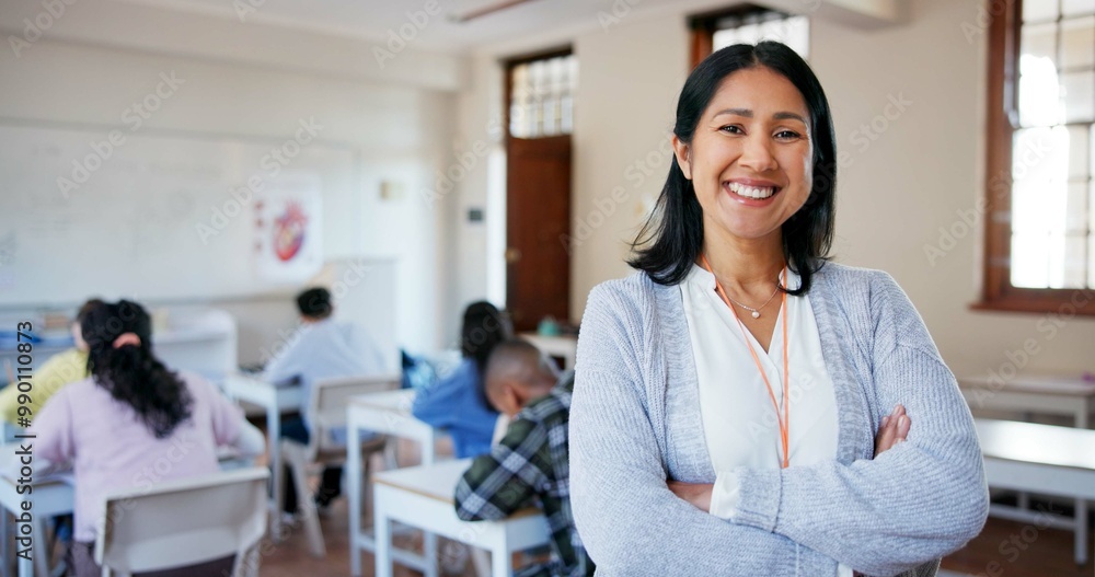 Teacher, portrait and arms crossed in classroom with students for education, lesson or scholarship. Educator, woman or happy at school for teaching children, learning support or confidence at academy