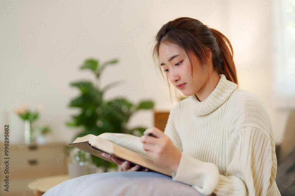 Young asian women in sweater sitting on comfortable couch and opening a book for reading to learning education while relaxation and doing activity to spending time with slow life lifestyle at home
