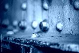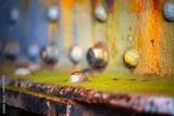 Corroded screws and rivets in a weathered steel beam. Colorful detail at an abandoned blast furnace in the Ruhr area, Germany. Moss and algae cover the surfaces of old machine parts. Humid and filthy.