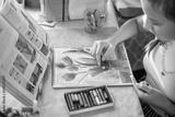 A little girl happily draws in a sketchbook at a table littered with colored pencils and pastels in a bright, sunny cheerful setting. Drawing of flowers