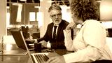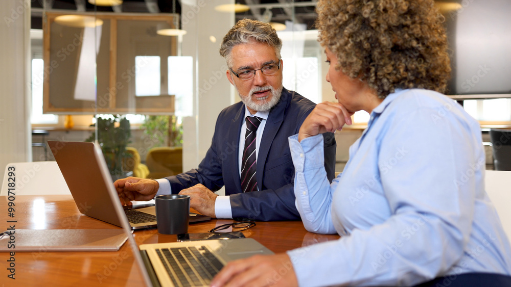 Mature businessman and his female colleague working together at the company office